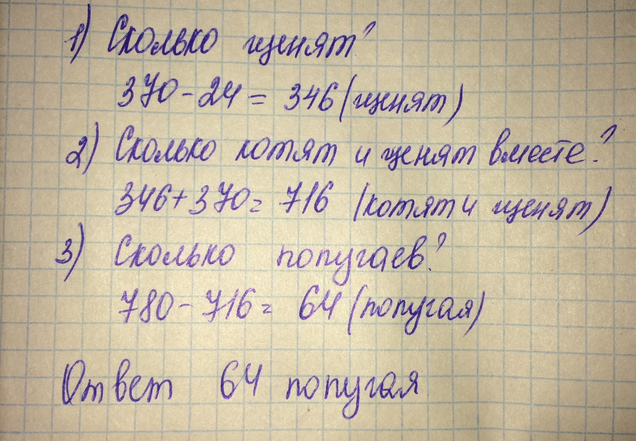 В зоомагазине 780 животных .из них 370 котят а щенят на 24 меньше а остальные -попугаи.Сколько попугаев в зоомагазине