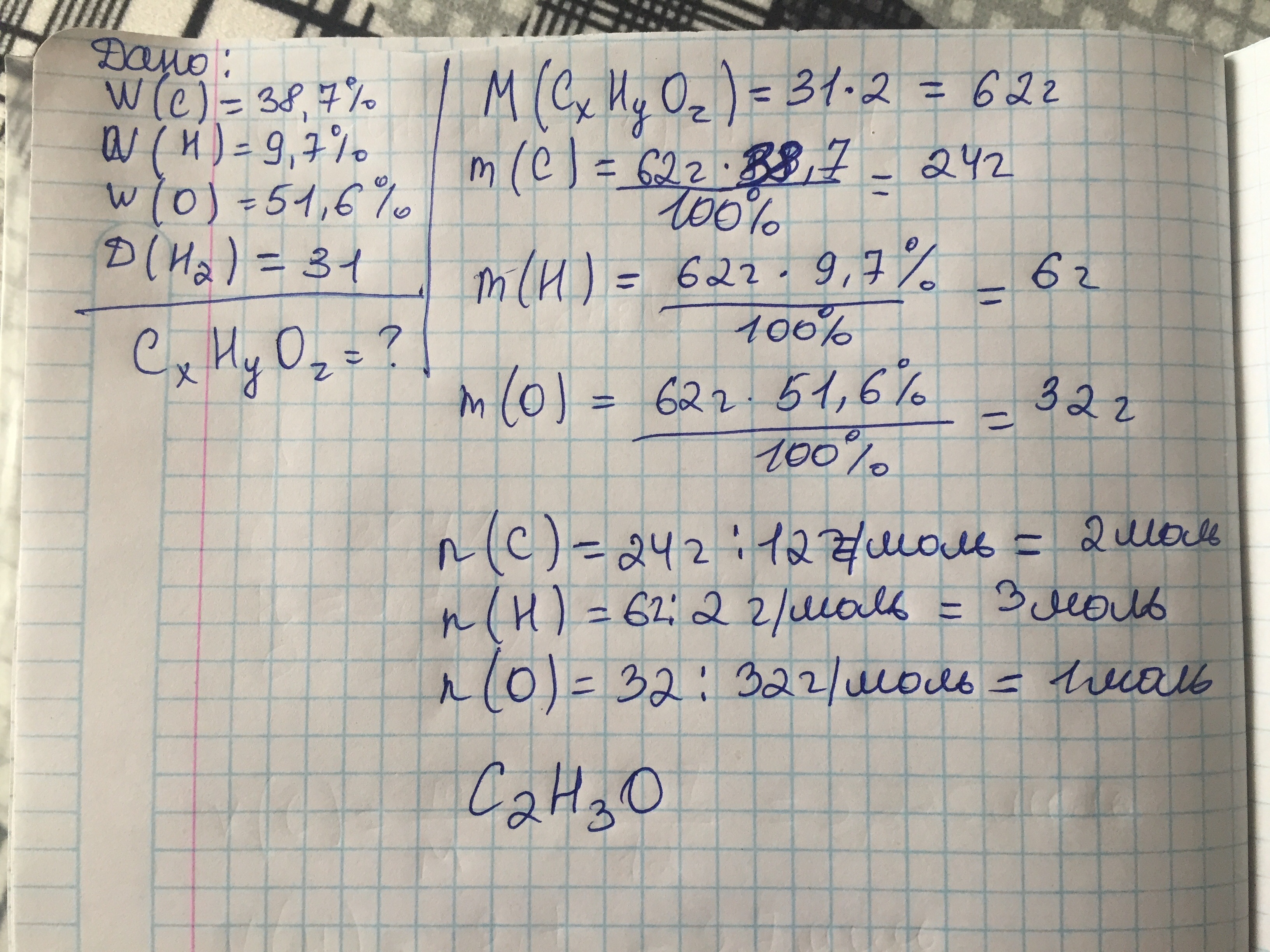 выведите формулу органического вещества имеющий следующий состав 38.7% углерода 9,7 водорода 51,6 % кислода. относительная плотность этого вещества по водороду равна 31.