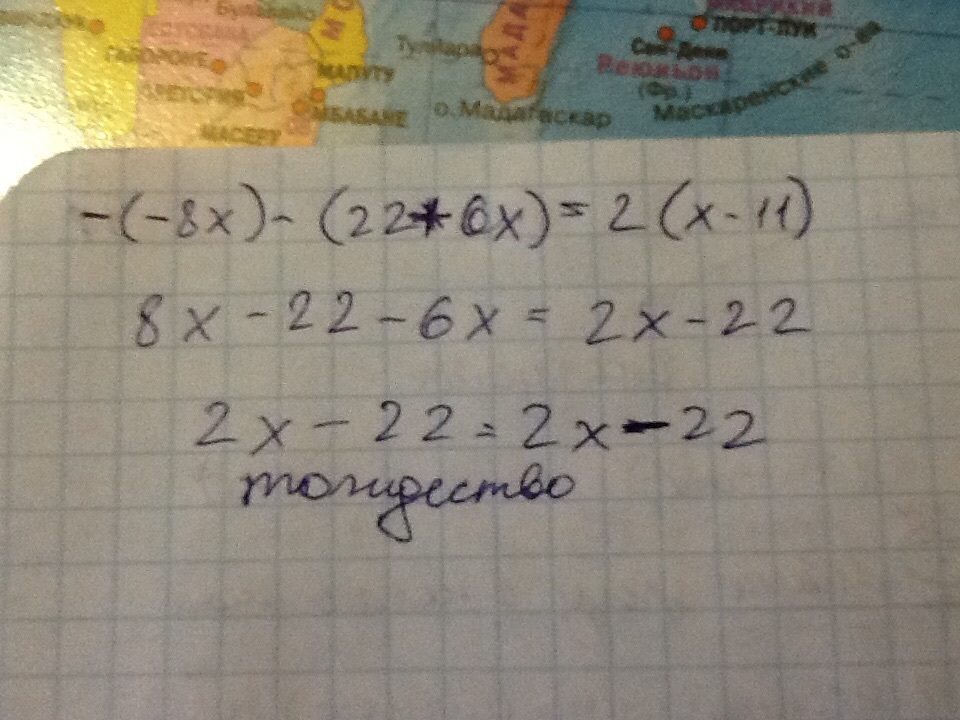 Левая часть уравнения: -(-8х)-(22+6х)= 8х-22-6х= 2х-22=2(х-11)