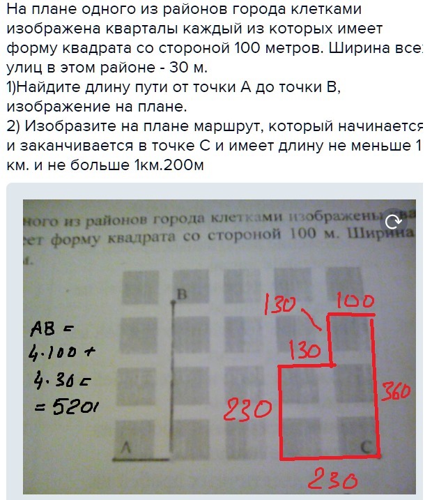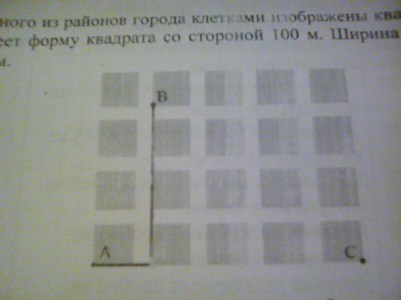 На плане одного из районов города клетками изображена кварталы каждый из которых имеет форму квадрата со стороной 100 метров. Ширина всех улиц в этом районе - 30 м.