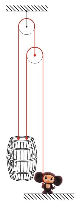 Масса Чебурашки 4 кг. Какова наибольшая масса бочки, которую он сможет поднять при помощи показанного устройства? Блоки невесомы, трения в блоках нет.