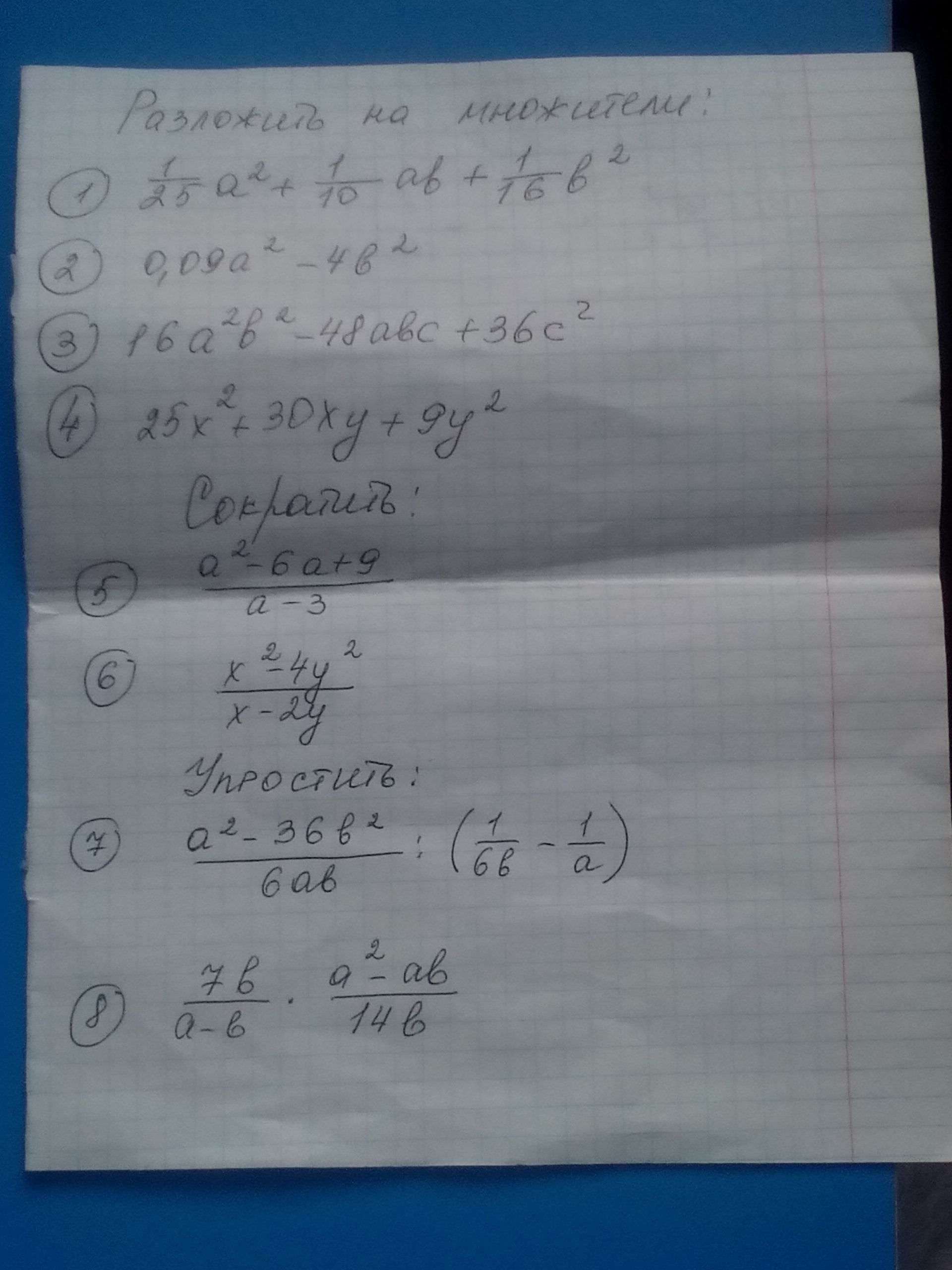1/25a^2+1/10ab+1/16b^2=(1/5a+1/4b)^2; 0,09a^2-4b^2=(0,3a-2b)(0,3a+2b); 16a^2b^2-48abc+36c^2=4(4a^2b^2-12abc+9c^2)=4(2ab-3c)^2; 25x^2+30xy+9y^2=(5x+3y)^2; a^2-6a+9/a-3=(a-3)^2/(a-3)=a-3.