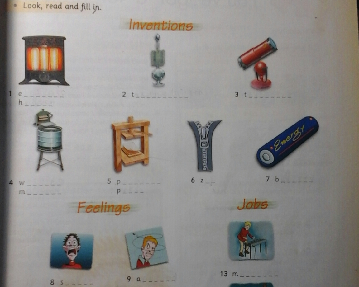 1) electric heater 2)t hermometen 3)telescope 4) washing mashine 5) printing press 6) zip 7) battery 8) scared 9) annoyed 13) misicial