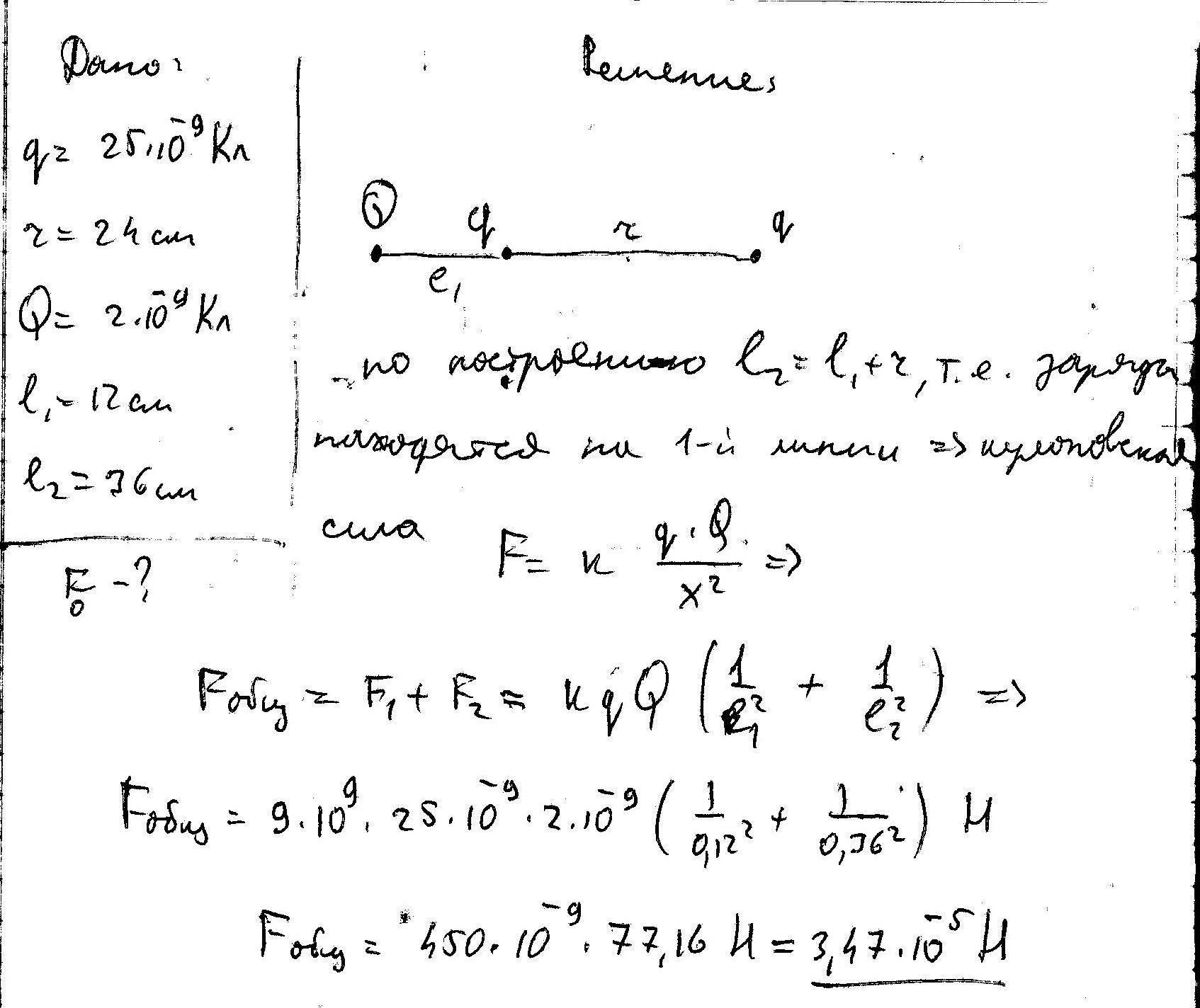2 заряда по 25 нано Кулон размещенные на расстоянии 24 см друг от друга, и создают электрическое поле. С какой силой это поле действует на заряд равный 2 нКл, который находится в точке отдаленной от первого на 12 см, от другого на 36 см если заряды одноименные