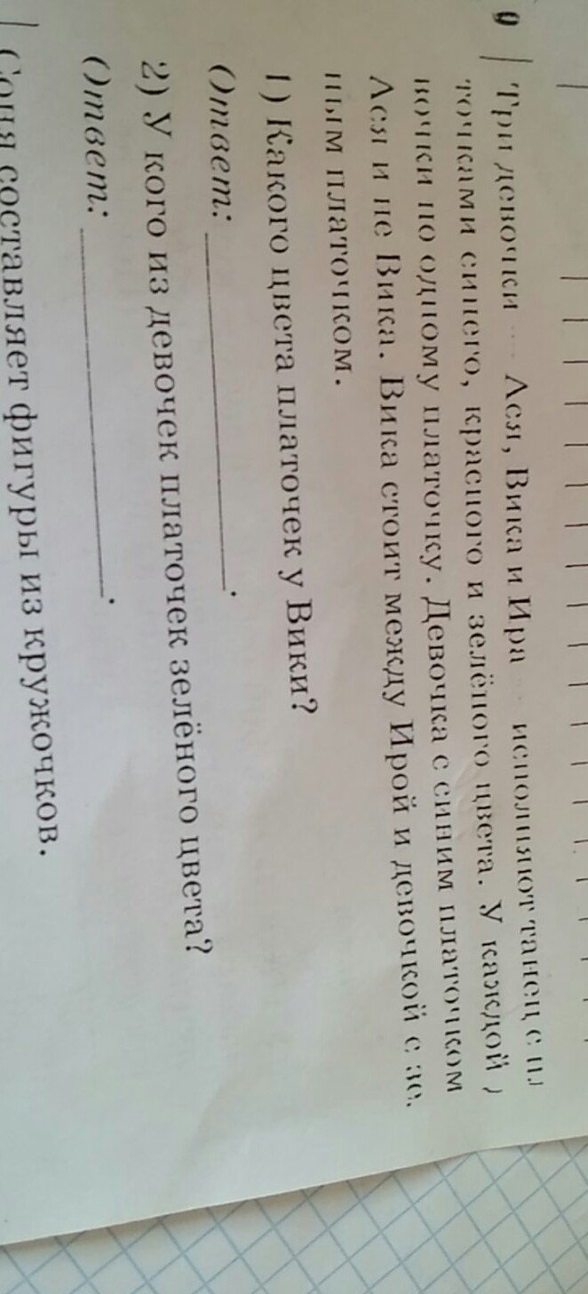 2) Ответ: У Аси зеленый платочек Потому что девочка с синим платком это Ира Если Вика стоит с Ирой (у нее синий платок) то тогда у Аси зеленый платок А остается только один платок- это красный