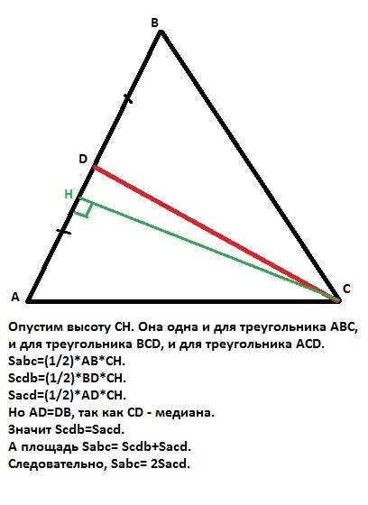 Медиана CD треугольника ABC делит его на два треугольника. Докажите, что площадь треугольника ABC вдвое больше, чем площадь треугольника ACD
