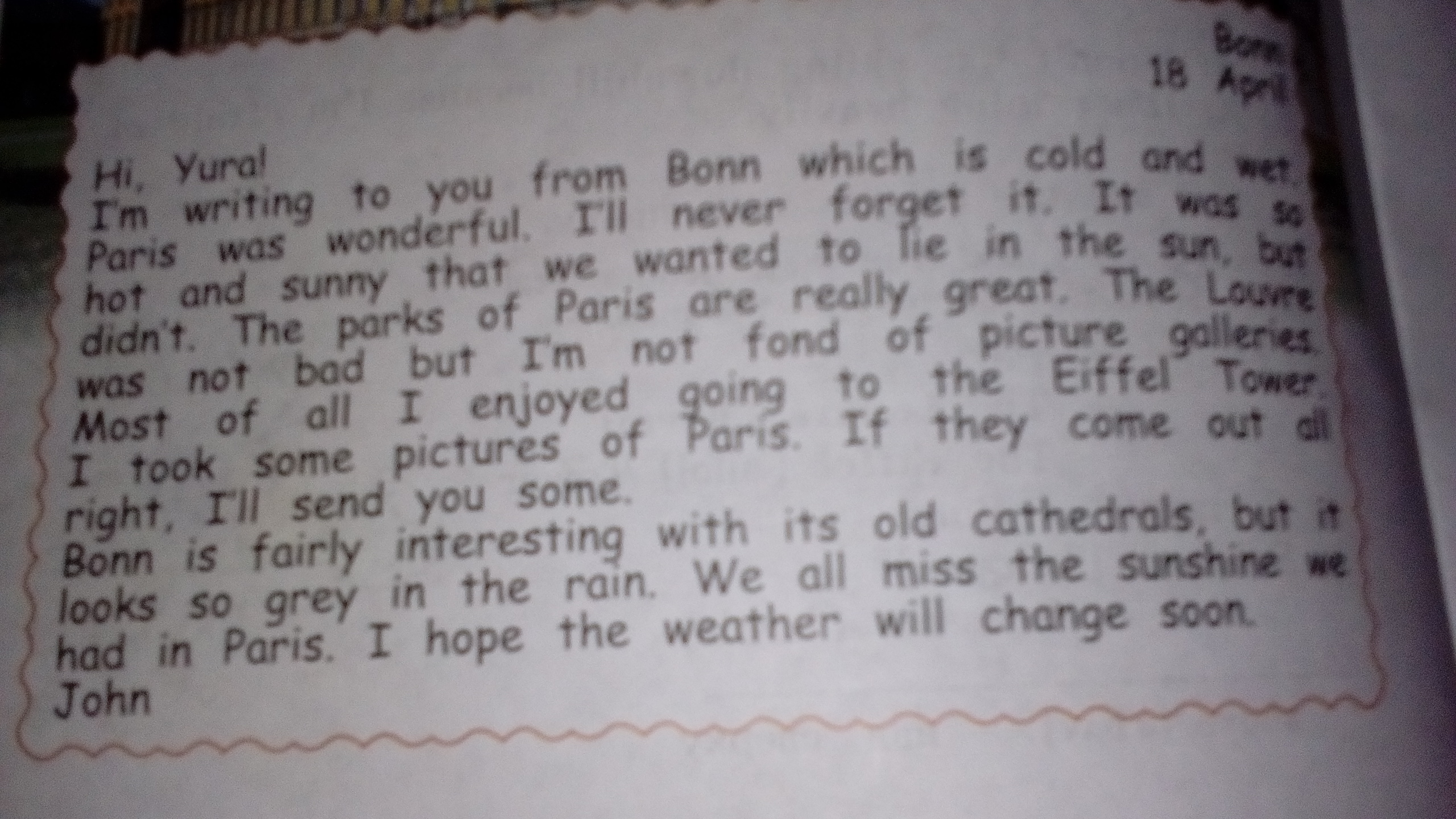 Я пишу тебе из Бонна, в котором холодно и влажно. Париж был чудесен. Никогда не забуду его. Было так жарко и солнечно, что нам хотелось лежать на солнце, но мы не стали. Парки в Париже прекрасны. Лувр был не плох, но я не очень люблю картинные галереи. Больше всего мне понравилось на Эйфелевой башне. Я сделала несколько фотографий Парижа. Если они хорошие, я тебе отправлю некоторые.