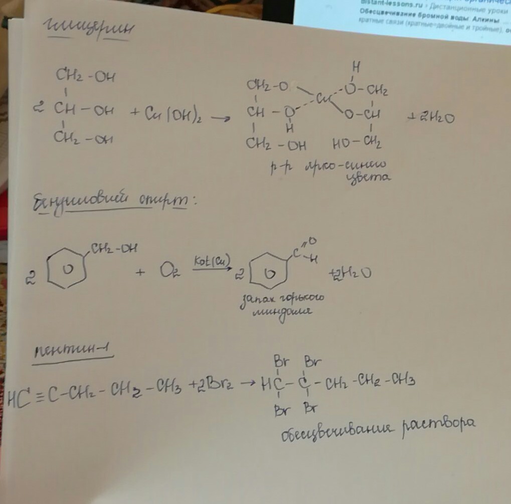 В трёх пробирках находятся пентин - 1, глицерин и бензиловый спирт. Предложите реактивы с помощью которых можно различить эти вещества, запишите соответсвующие реакции.