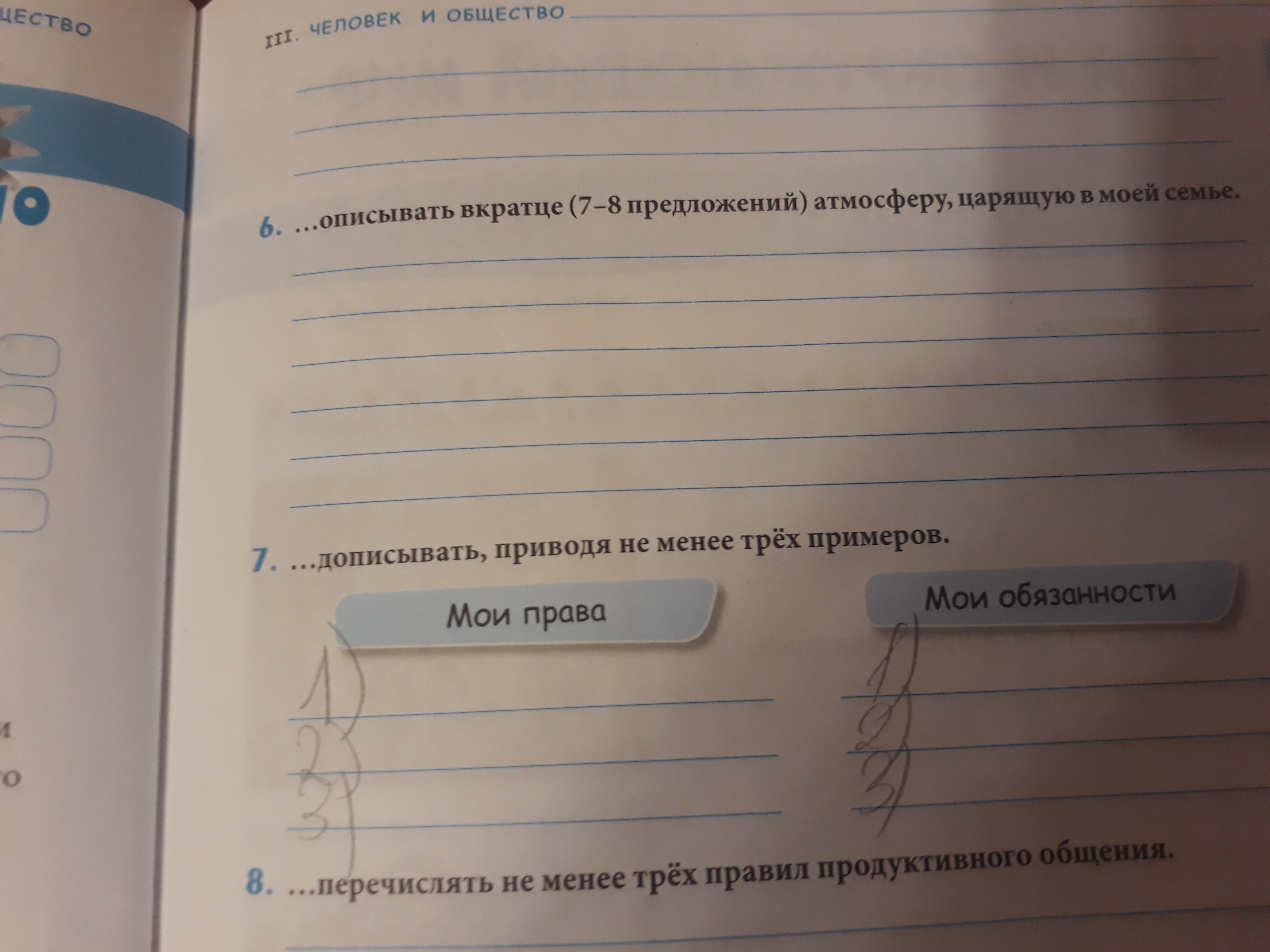 6 .Атмосфера в моей семье спокойная .Мы (мама,папа,сестра или брат,Я) не ругаемся ,живем мирно.Все друг друга уважают ,помогают. Мы заботимся друг об друге ...Помогать друг дружку вошло в привычку.Мы не предаем друг друга.Не ссоримся с друг другом , а если ругаемся только по большим причинам .Из-за мелочей не за что.