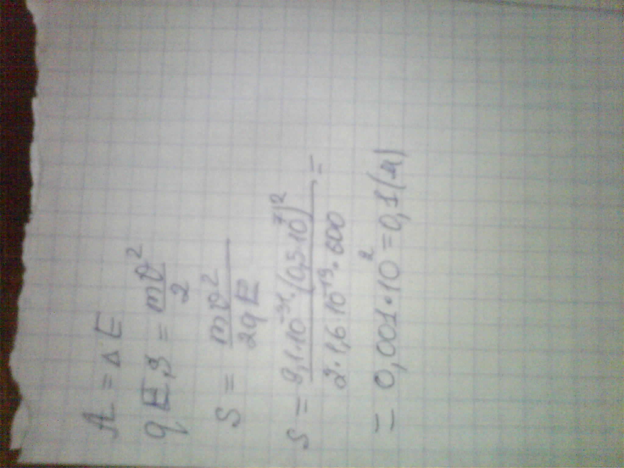 в однородное электрическое поле со скоростью 0,5*10^7 влетает электрон и движется по направлению линий напряженности поля .Какое расстояние пролетит электрон до полной потери скорости , если модуль напряженности равен 600 В/м