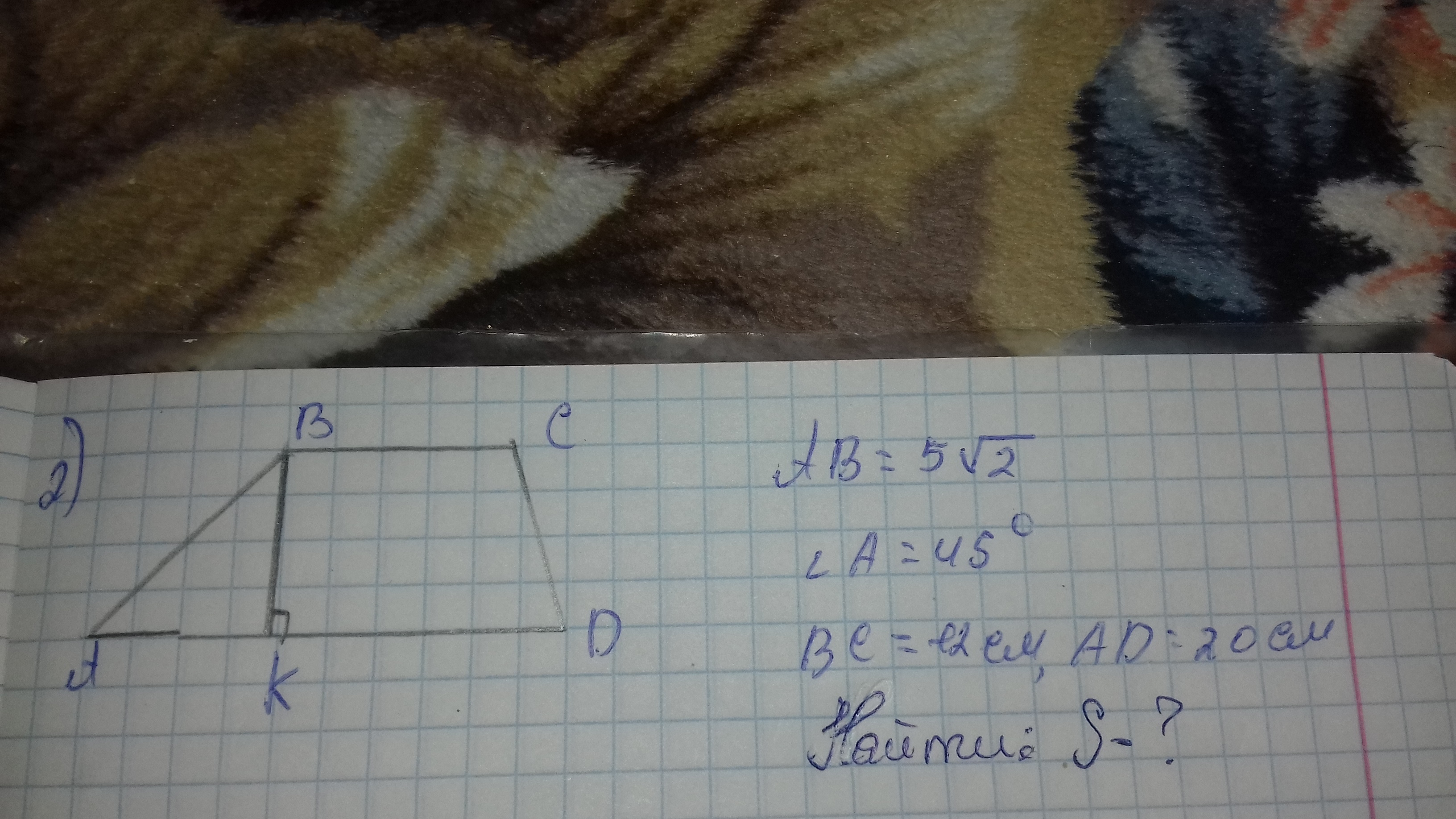 S = ((BC+AD)/2)*BK; - формула площади трапеции(полусумма оснований).