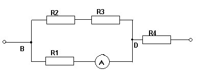 Известно, что напряжение на участке ВД равно 6 В, показания амперметра 2А, сопротивление второго, третьего и четвертого проводников соответственно 4 Ом, 2 Ом, 1Ом. Определите чему равно первое сопротивление, сила тока во втором, третьем и четвертом проводниках, напряжение на четвертом проводнике