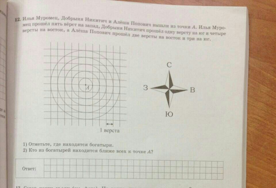 Илья Муромец, Добрыня Никитич и Алёша Попович вышли из точки А. Илья Муромец прошел 5 верст на запад, Добрыня Никитич прошел одну версту на юг и четыре версты на восток, а Алёша Попович прошёл две версты на восток и три на юг.