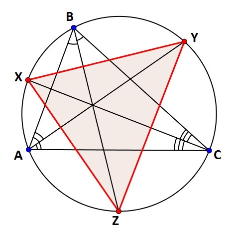 Биссектрисы треугольника ABC пересекают его описанную окружность в точках X, Y, Z. Радиус вписанной окружности треугольника ABC равен 9. Радиус