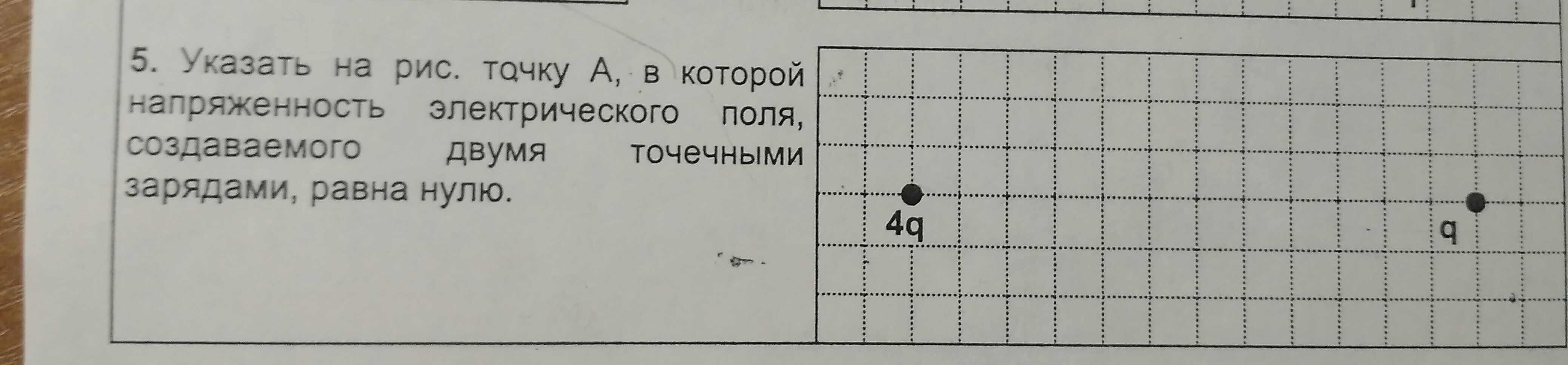 точка, где напряженность от двух зарядов нулевая находится на 8 клеток от левого заряда 4q правее. Поставь ручкой в этом месте жирную точку, обозначь например буквой А.