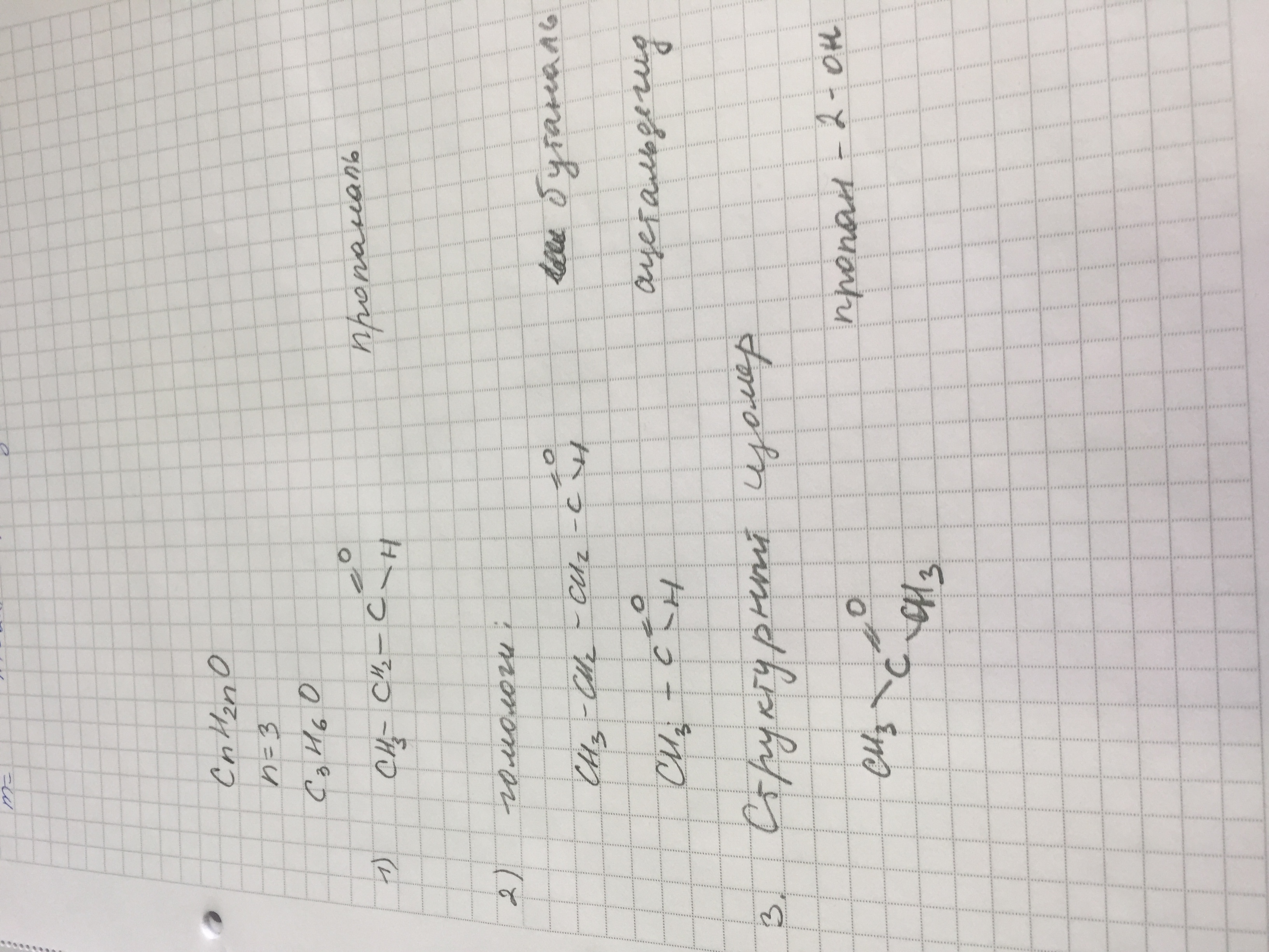 общая формула альдегида CnH2nO.Составьте формулу кислоты,если n=3.Для данного вещества составьте структурные формулы 2-х гомологов и 1-го изомера.Дайте названия