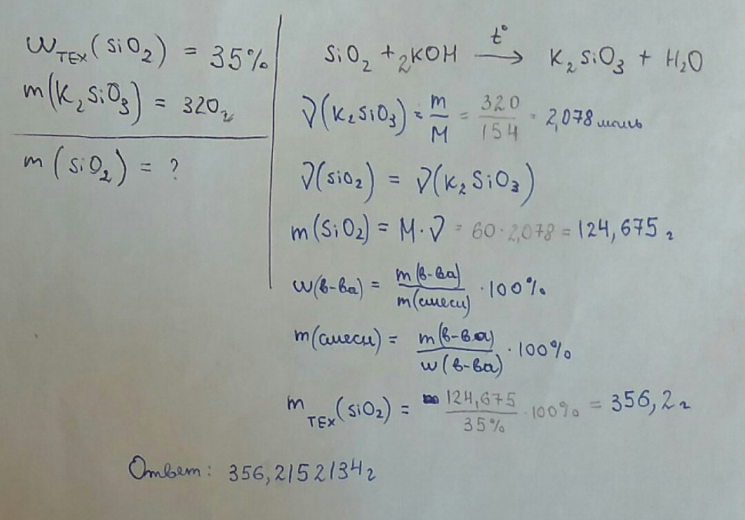 песок содержит 35% примесей сплавили с гидроксидом калия получив силикат калия массой 320г вычислить массу технического песка