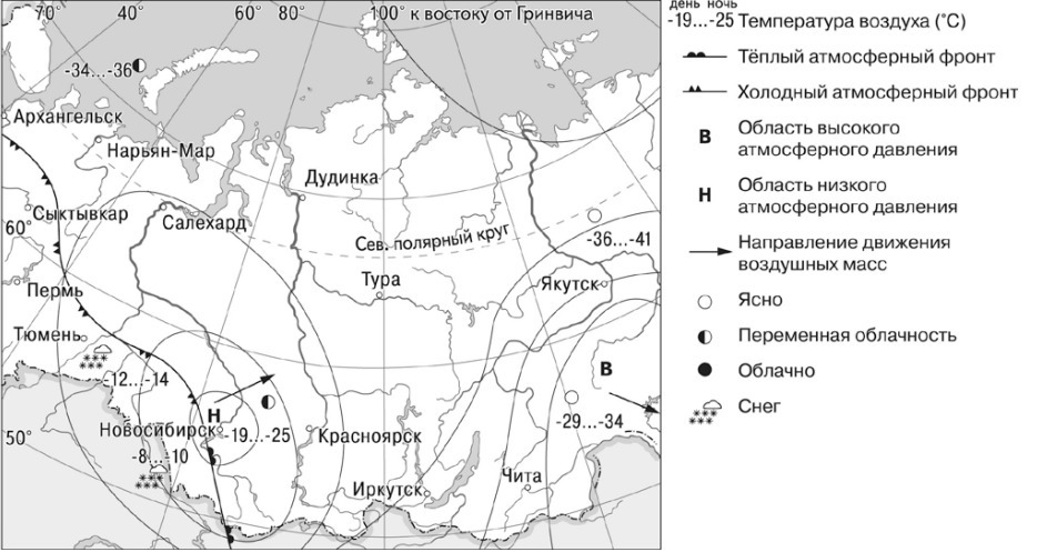 3) Новосибирск находится в зоне действия циклона, ожидается переменная облачность, температура воздуха от –19 °С днём, до –25 °С в ночные часы.