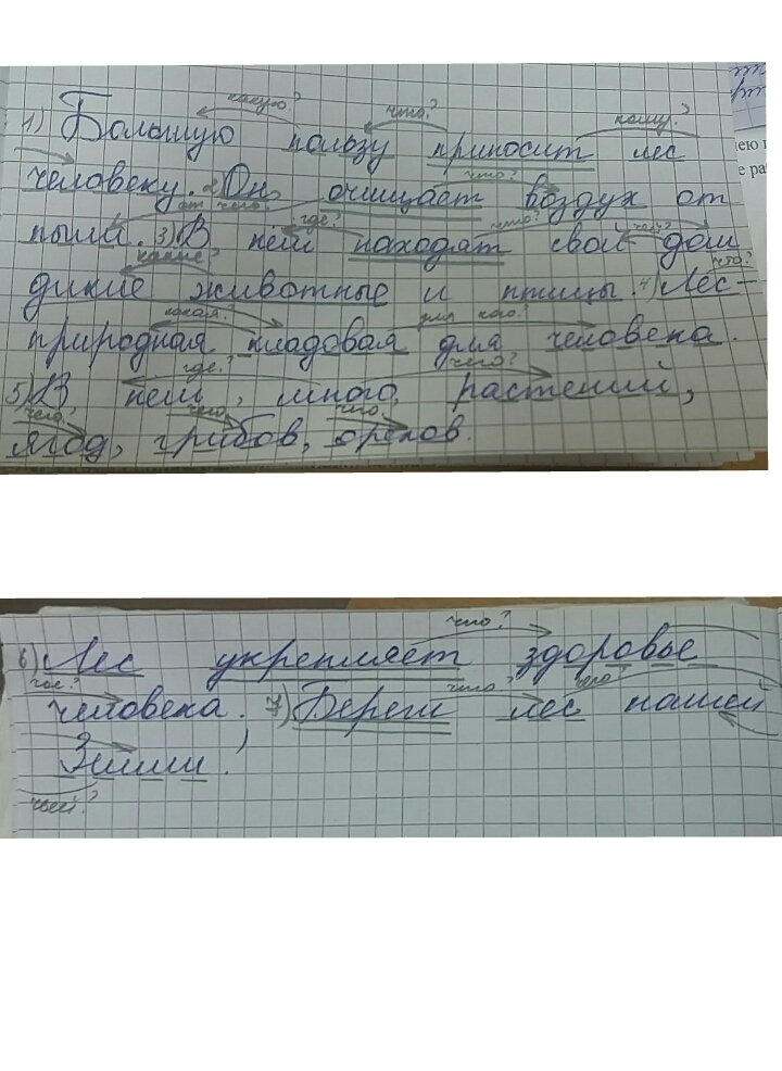 Найди в предложениях подлежащее, сказуемое и дополнение .Поставь вопросы . Укажи связь слов в предложениях. Большую пользу приносит лес человеку. он очищает воздух от пыли. в нём находят свой дом дикие животные и птицы. лес- природная кладовая для человека. в нём много растений ягод, грибов ,орехов. лес укрепляет здоровье человека. Береги лес нашей Земли!