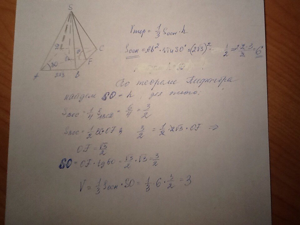 Основанием пирамиды служит ромб с углом 30° и стороной 2√3. Боковые грани пирамиды наклонены к плоскости основания под углом 60°. Найдите объём пирамиды. (обязательно с рисунком)