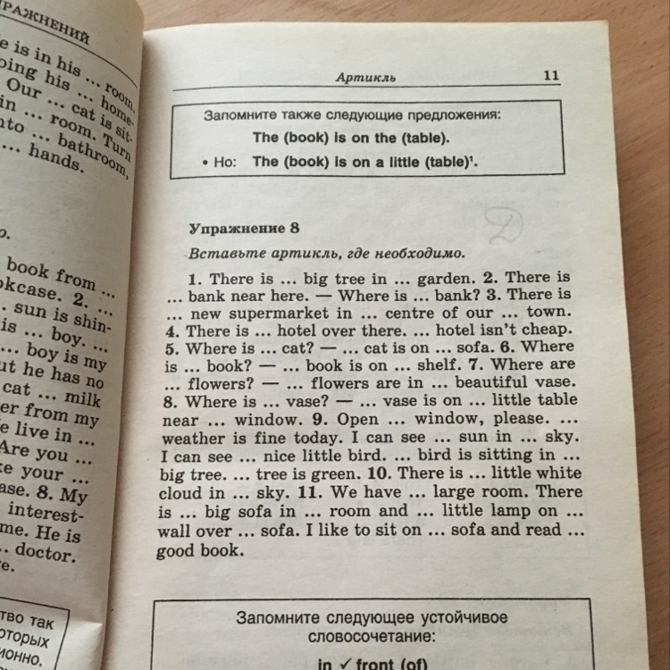 1 there is a big tree in the garden. 2 there is a bank near here. Where is a bank? 3 there is a new supermarket in the center of our town. 4 there is a hotel over there. The hotel isn't cheap. 5 where is a cat? The cat is on the sofa. 6 there is a book. The book is on the shelf. 7 where are flowers? The flowers are in beautiful vase. 8 where is a vase? The vase is on the little table near the window. 9 open the window, please. The weather is fine today. I can see the sun in the sky. I can see a nice little bird. The bird is sitting in a big tree. The tree is green. 10 there is a little white cloudin the sky. 11 we have a large room. There is a big sofa in the room and a litt lamp on the wall over the sofa. I like to sit on the sofa and read a good book.
