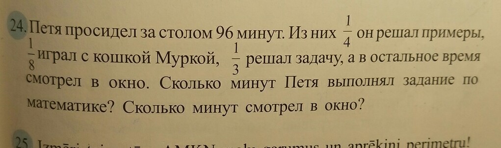 Ответ:56 мин. выполнял задания по математике,28 мин. смотрел в окно.