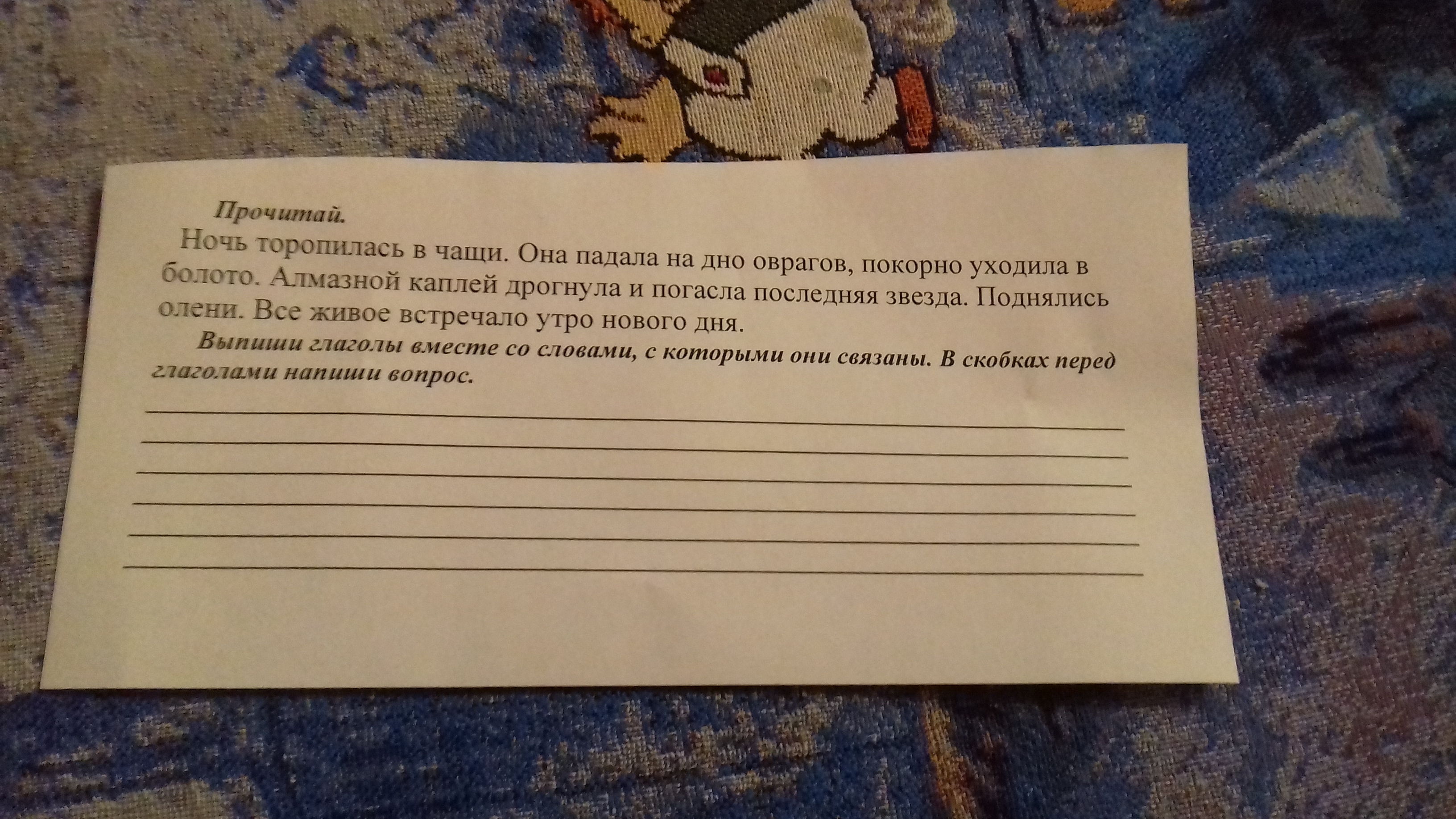 Торопилась(Куда?) в чащи,падала(на что?) на дно , уходила(куда?) в болото, дрогнула( что?) звезда погасла(какая?) последняя, поднялись кто? олени встречало ( что? ) утро