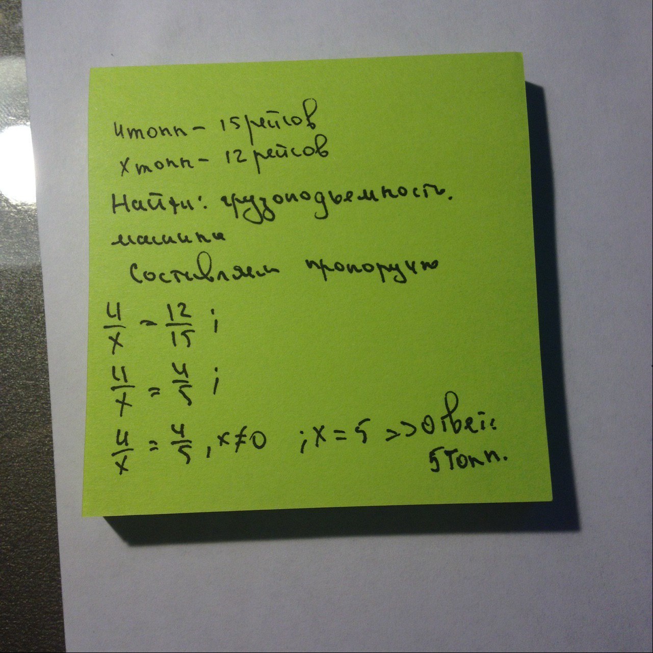 Для перевозки некоторого количества зерна автомашина, имеющая грузоподъемность 4 т, сделала 15 рейсов. Какую грузоподъемность должна иметь автомашина, чтобы такое же количество зерна перевезти за 12 рейсов? и обьясните пожалуйста