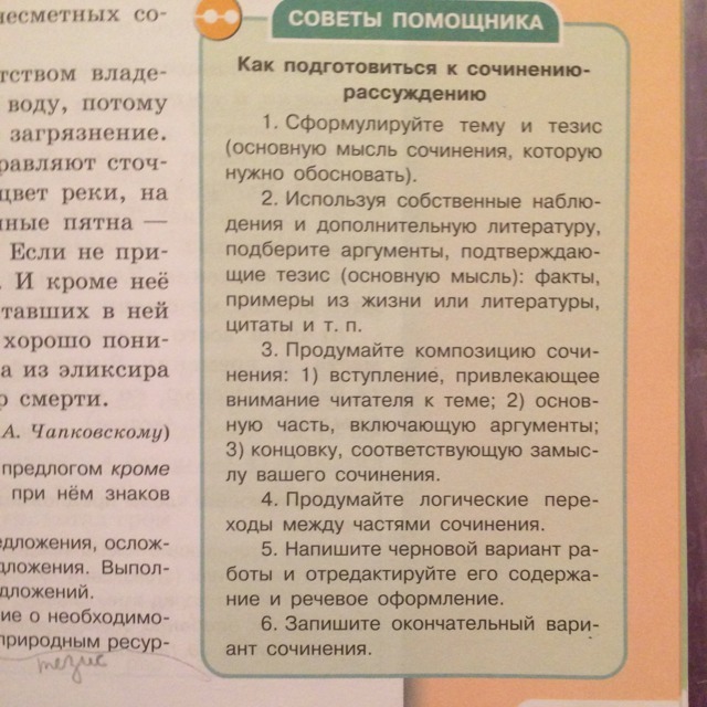 В зеленой рамке под названием "Советы помощника" рассказывают\ помогают\ советуют как стоит подготавливаться к сочинению - рассуждению