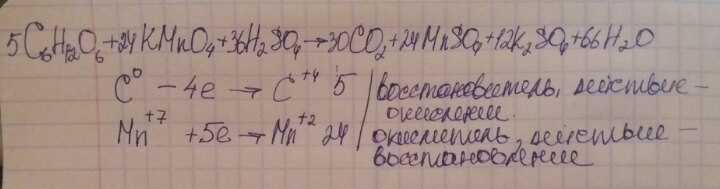 5C6H12O6 + 24KMnO4 + 36H2SO4 → 30 CO2 + 24MnSO4 + 12K2SO4 + 66H2O