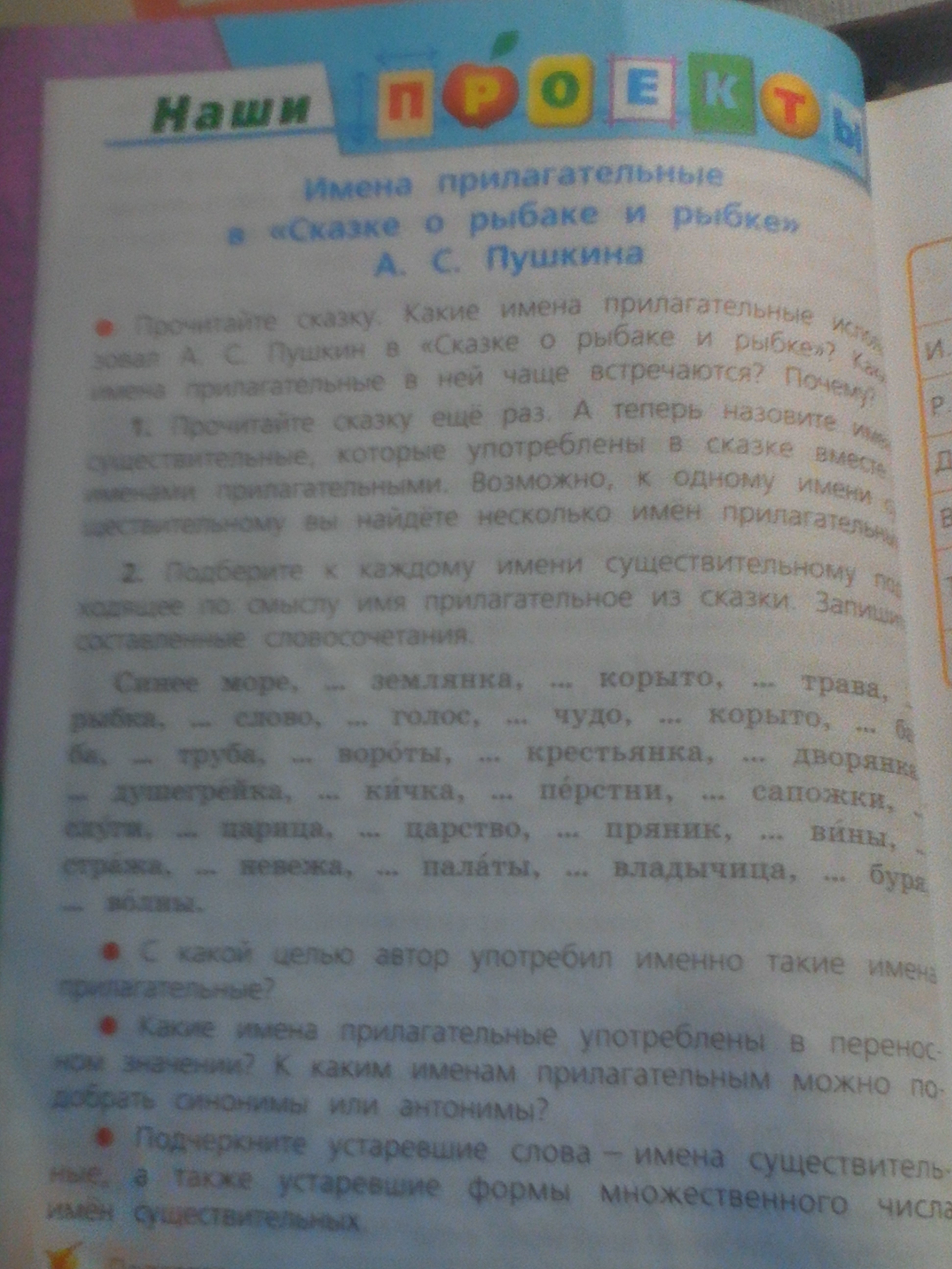корыто (какое?) разбитое,трава (какая?) зеленая,рыбка (какая?)золотая,слово (какое?)доброе,сапожки (какие?)волшебные, царица (какая?)прекрасная,