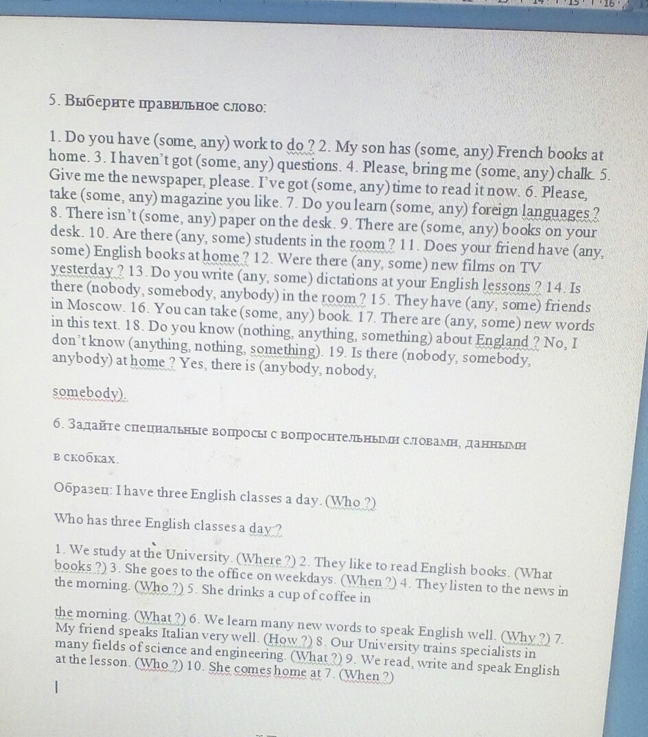 1) Any. 2) Some. 3) Any. 4) Some. 5) Some. 6) Some. 7) Any. 8) Any. 9) Any. 10) Any. 11) Any. 12) Any. 13) Any. 14) Anybody. 15) Some. 16) Some. 17) Some. 18) Anything. Anything. 19) Anybody. Somebody. На первое задание ответила