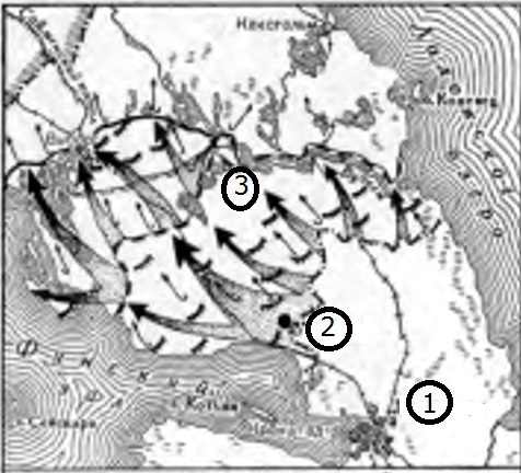 Назовите без кавычек место наиболее значительных боев, обозначенное на схеме арабской цифрой.