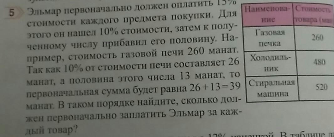 Стоимость холодильника - 480 манат. 10% стоимости холодильника - 48 манат. Половина этого числа - 24 манат. 24+48=72 ( это 15% первоначальной стоимости холодильника)