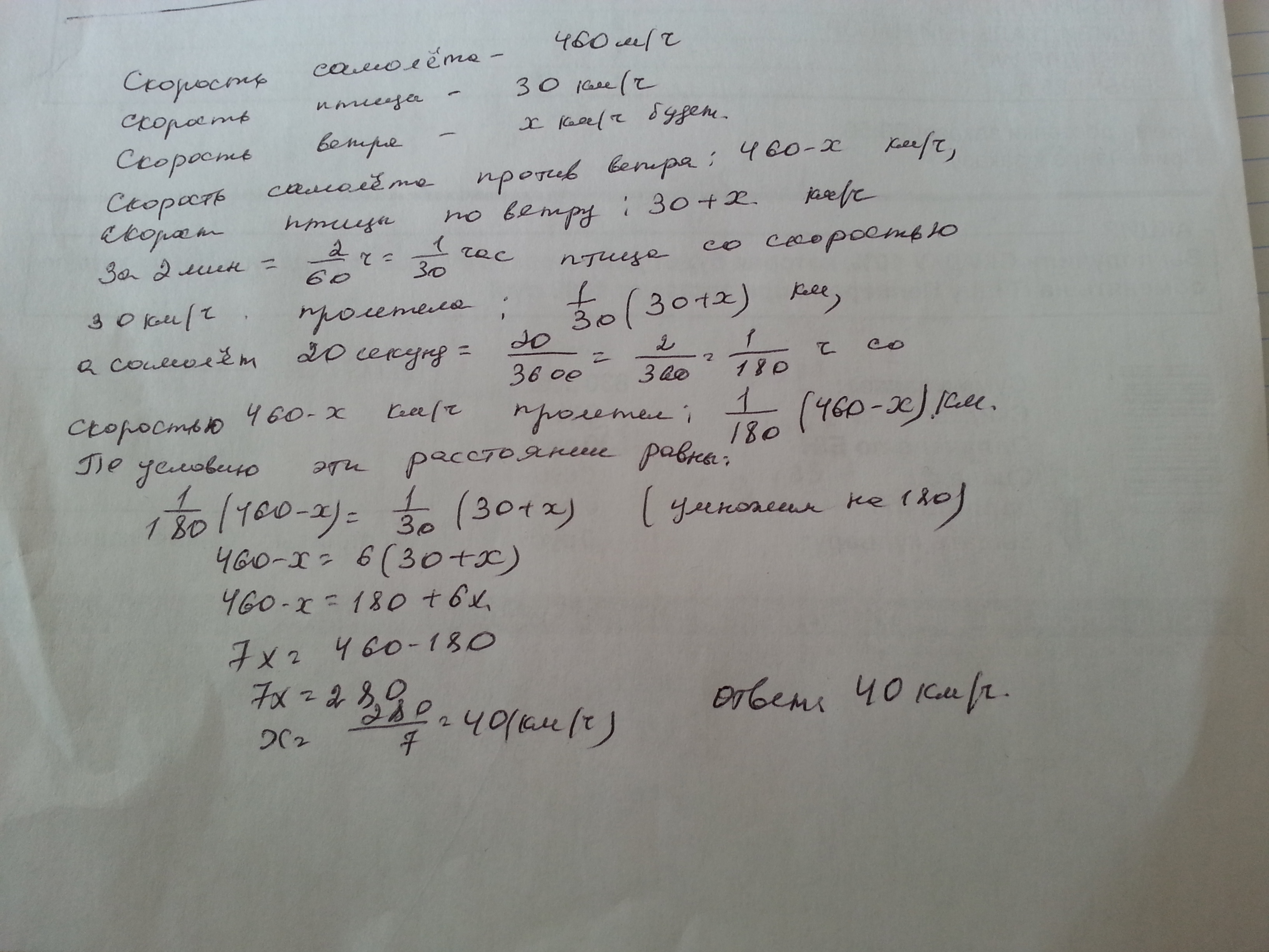 самолёт и птица летели в противоположных направлениях ,причем самолет против ветра,а птица по ветру.за 2 минуты птица пролетела такое же расстояние ,что и самолёт за 20 секунд .найди скорость ветра ,если скорость самолёта равна 460 м/ч ,а скорость птицы 30 км/ч