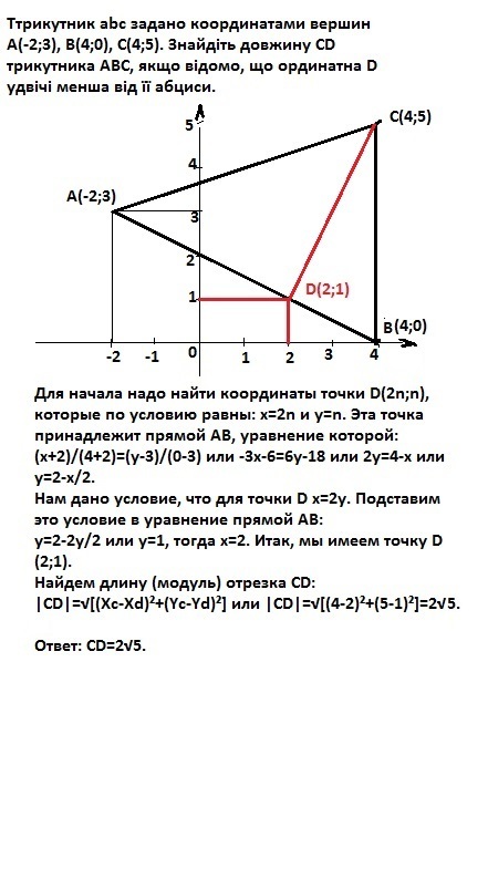 трикутник abc задано координатами вершин A(-2;3), B(4;0), C(4;5). Знайдіть довжину CD трикутника ABC, якщо відомо, що ординатна D удвічі бменша від її абциси
