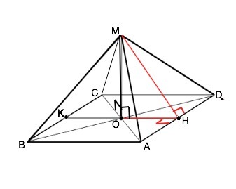 Высота пирамиды перпендикулярна плоскости основания, ⇒ МО перпендикулярна любой прямой, проходящей через т.О.