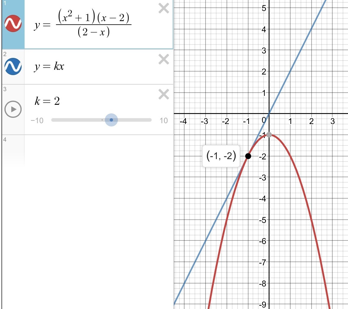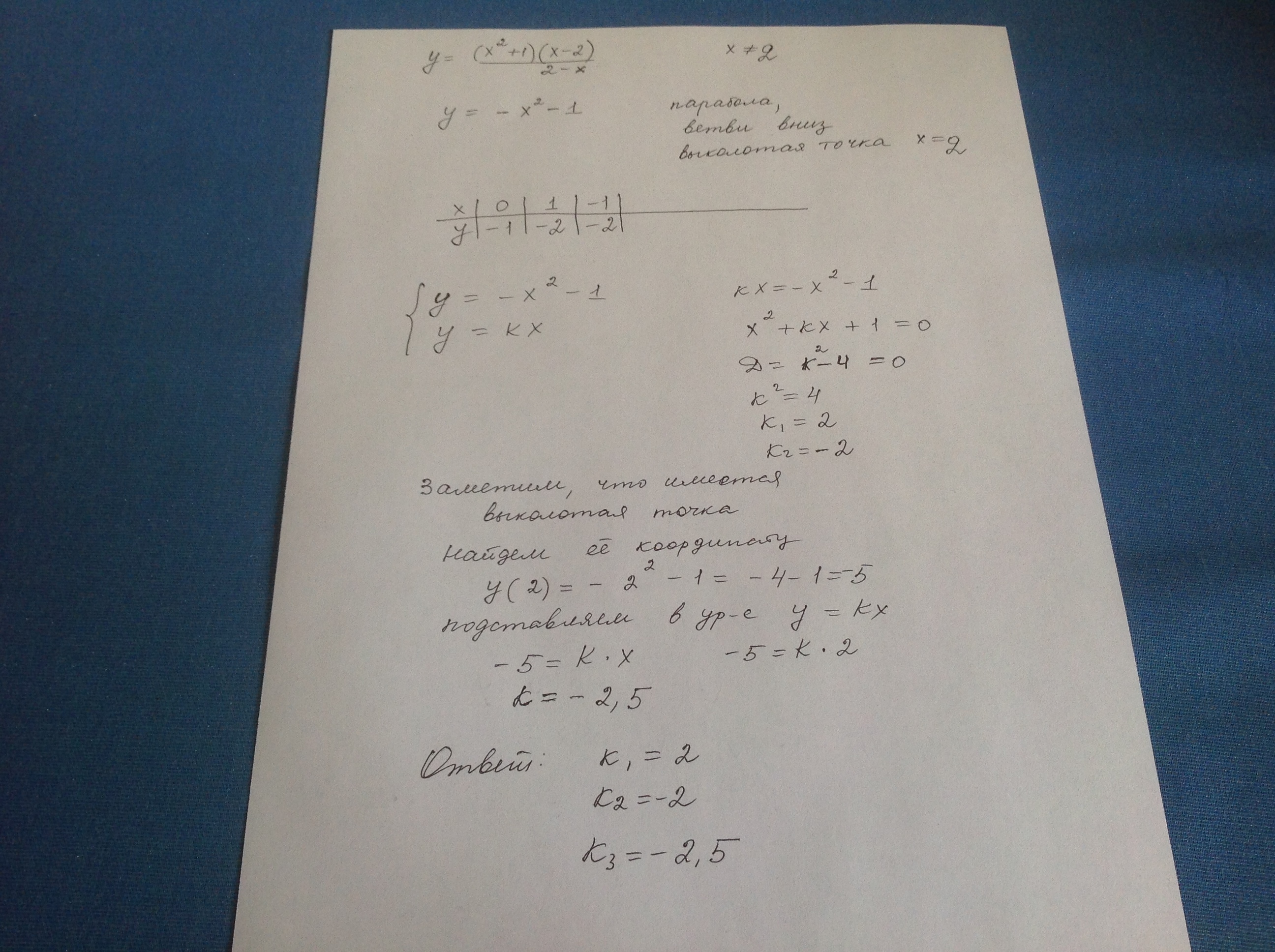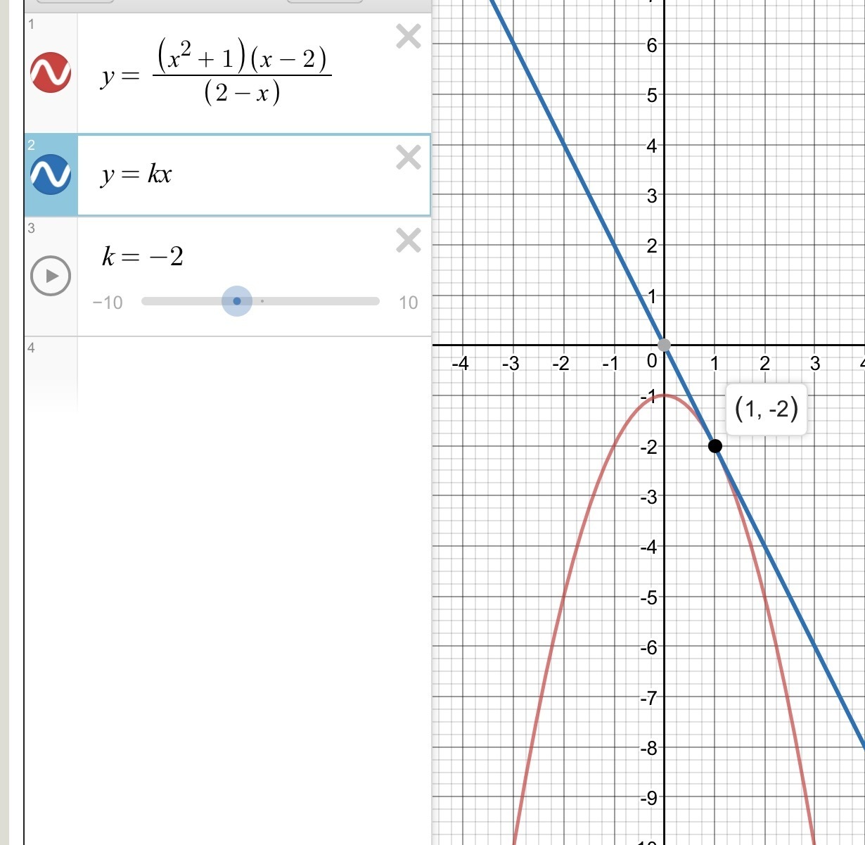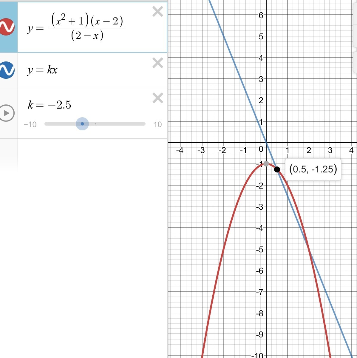 постройте график функции у=(х2+1)(х-2)/2-х и определите,при каких значениях К прямая у=кх имеет с графиком ровно одну общую точку