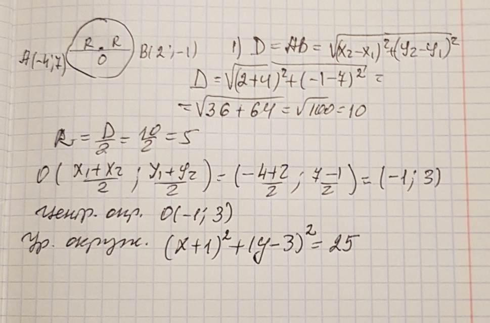 точки A (-4;-7) и BMW (2;-1) являются концами диаметра окружности. Найдите диаметр окружности и координаты её центра. Запишите уровнение окружности.