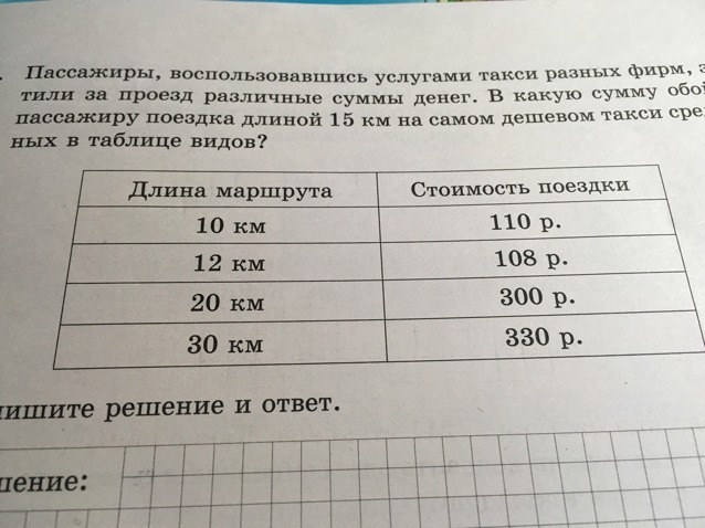 пассажиры, воспользовавшись услугами такси разных фирм , заплатили за проезд различные суммы денег . В какую сумму обойдется пассажиру поездка длиной 15 км на самом дешевом такси среди данных в таблице видов?