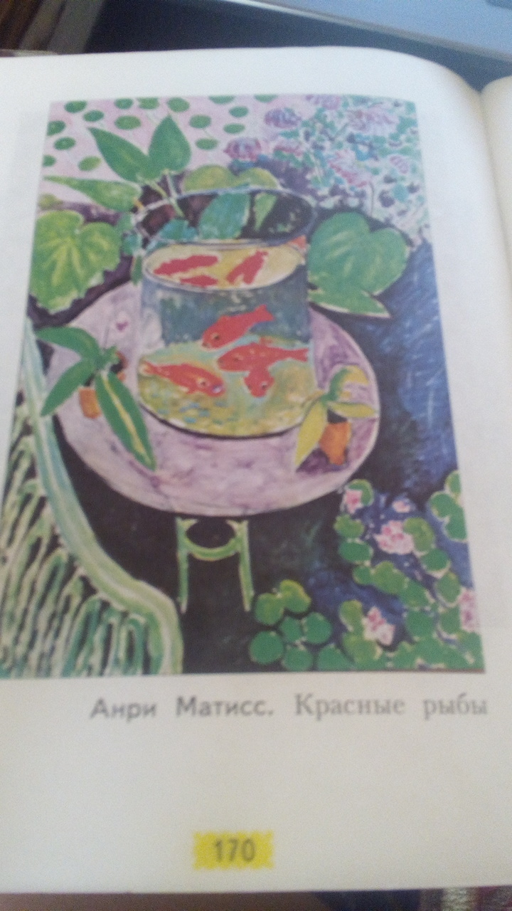 круглый столик с рыбками в аквариуме. Движение кружащихся в аквариуме рыбок составляет основу всей композиции. Вслед за ними в это движение включаются зеленые листья растений, завитки ножки стола. Именно богатство живых закругленных линейных ритмов является основой для орнаментальной организации поверхности холста. Динамику композиционного построения подчеркивает обратная перспектива в изображении стола, что свидетельствует об изучении художником приемов средневековой живописи, в частности персидских миниатюр, древнерусских икон и фресок. Еще более усложняя перспективное построение, Матисс использует несколько точек зрения на предметы. Так, на аквариум он смотрит сбоку, столешницу изображает сверху, а ее ножку снова сбоку. Еще больший эффект производит распределение чистых ярких красок. Цветовым фокусом картины являются ярко-красные рыбки. Оставленный вокруг них белый холст усиливает выразительность красного. Контрастом к красным рыбкам служат зеленые листья растений. Будучи очень чутким колористом, Матисс понимал, какое напряжение таит в себе сопоставление красного и зеленого, поэтому он нигде не соединяет эти цвета непосредственно. Вводя дополнительные оттенки, художник разрешает это противоречие в гармонии тонких соотношений розовых, сиреневых, оливковых тонов. Розовые и черные оттенки усиливают звучность зеленого, а розовый нимб вокруг аквариума сообщает всему колористическому решению особую прозрачность.