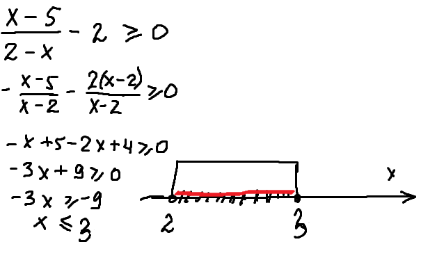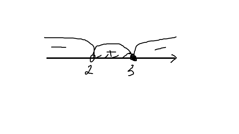 Чертим координатную прямую наносим числа 3 и 2, вычислям знаки на интервалах: