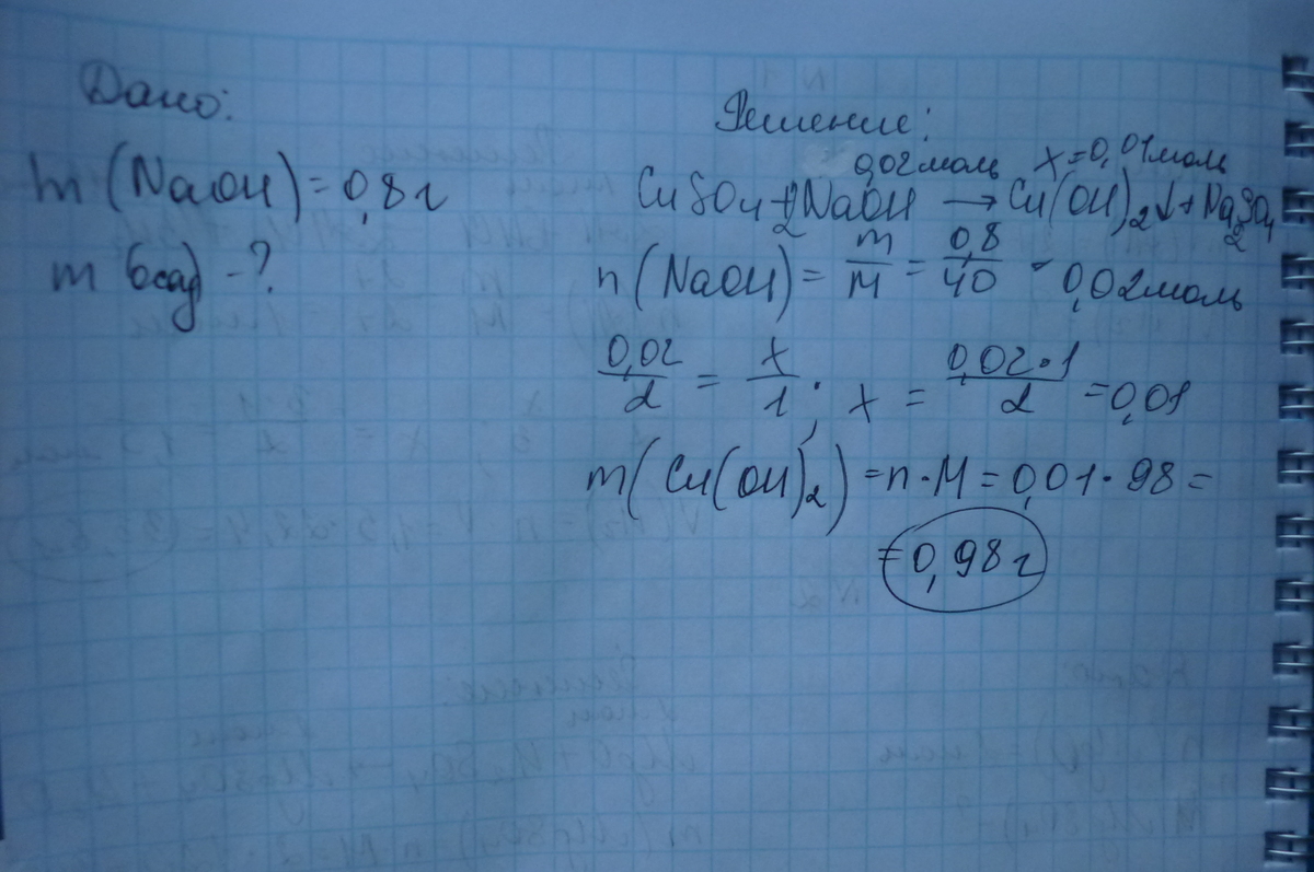 2) m(Cu(OH)2) = n(Cu(OH)2) * M(Cu(OH)2) = n(NaOH) : 2 * M(Cu(OH)2) = m(NaOH) : 2M(NaOH) * M(Cu(OH)2) = ((0,8 : (2 * 40)) : (98)) г. = ((0,8 : 80) * (98)) г. = 0,98 г.