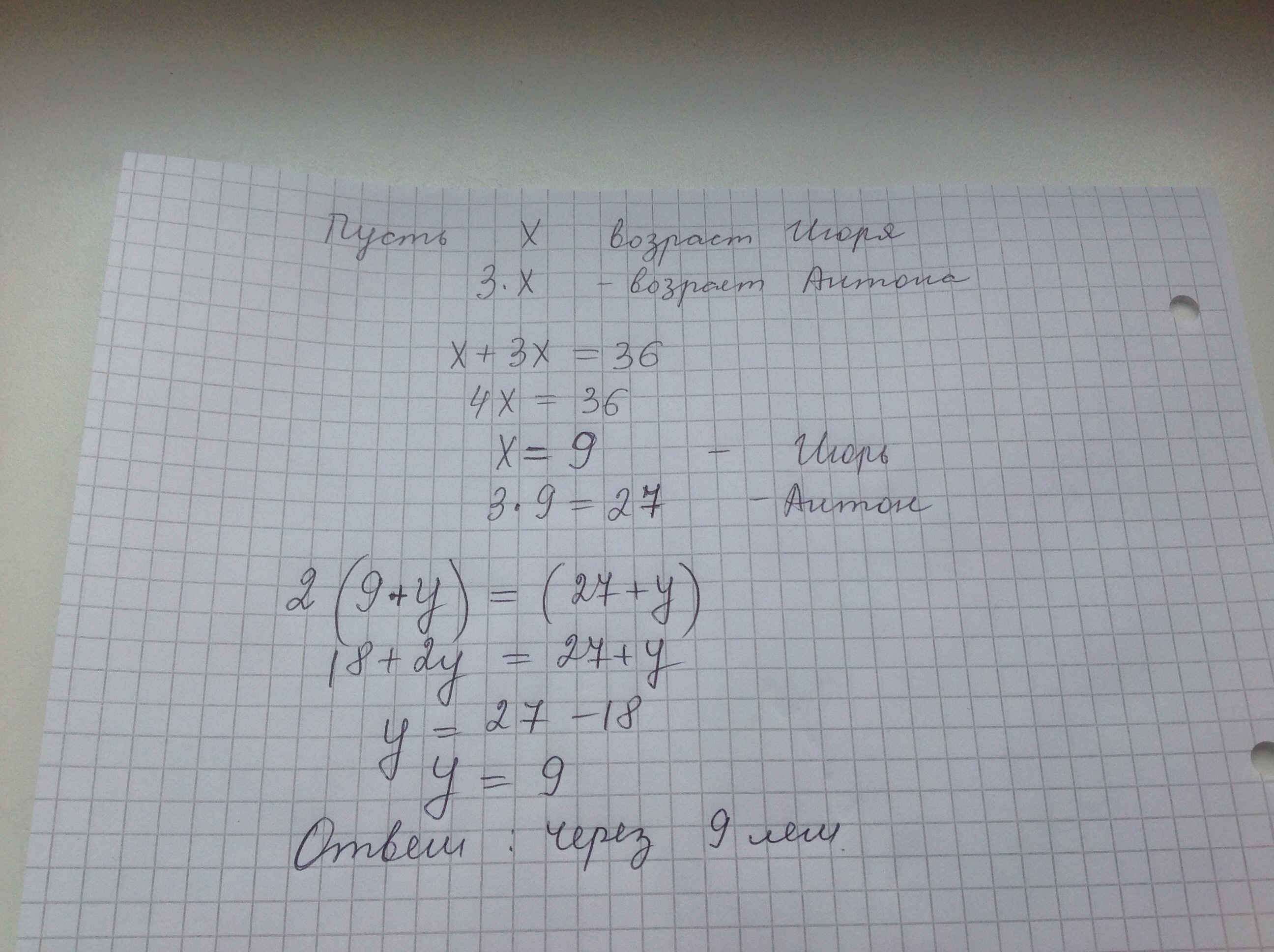 Антон втрое старше Игоря. Сумма их возрастов равна 36 годам. Через сколько лет Антон будет вдвое старше Игоря?