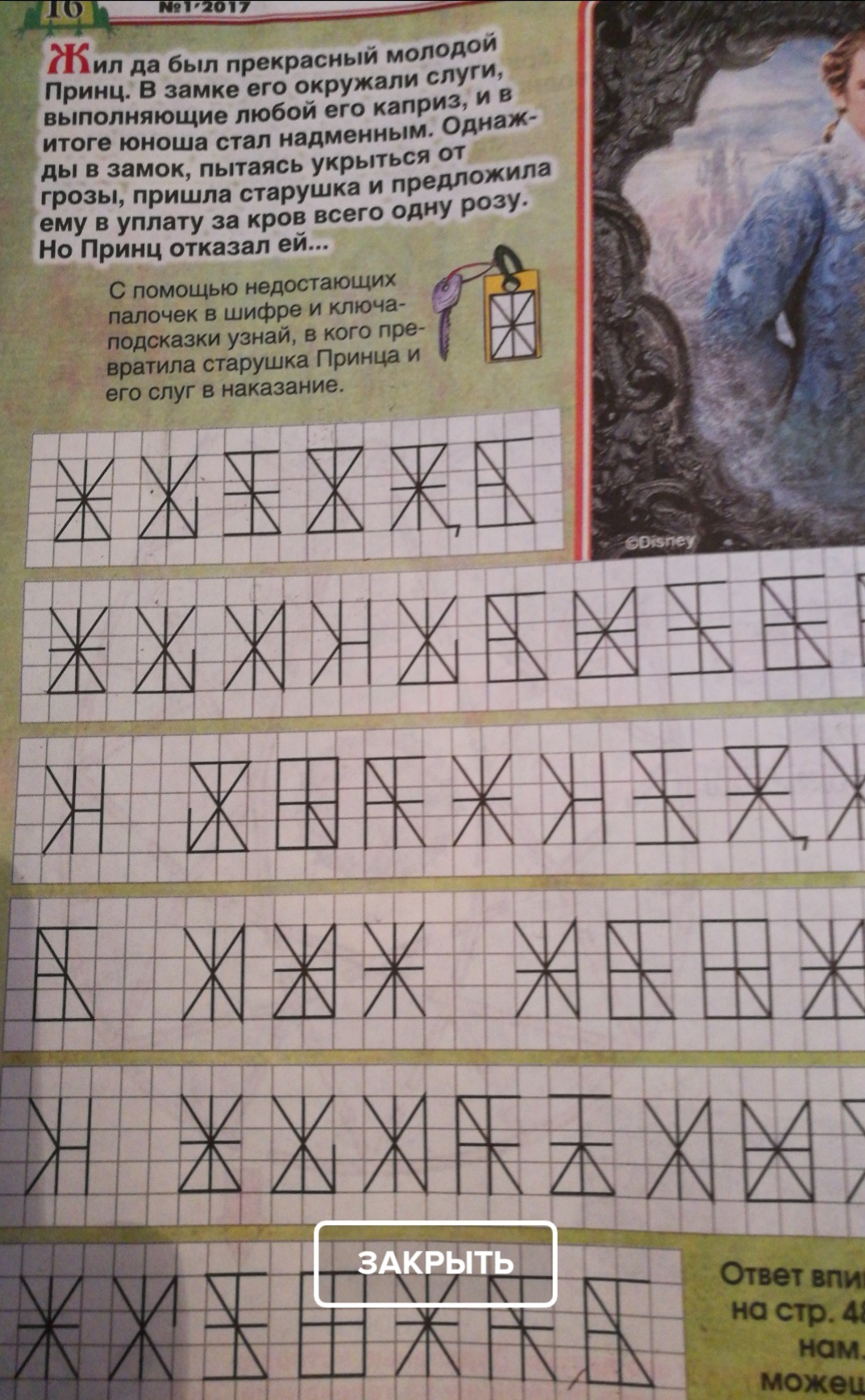 С помощью недостающих палочек в шифрах и ключа-подсказки узнай, в кого превратила старушка Принца и его слуг в наказание. Помогите пожалуйста срочно последнюю строчку!!!!!!!