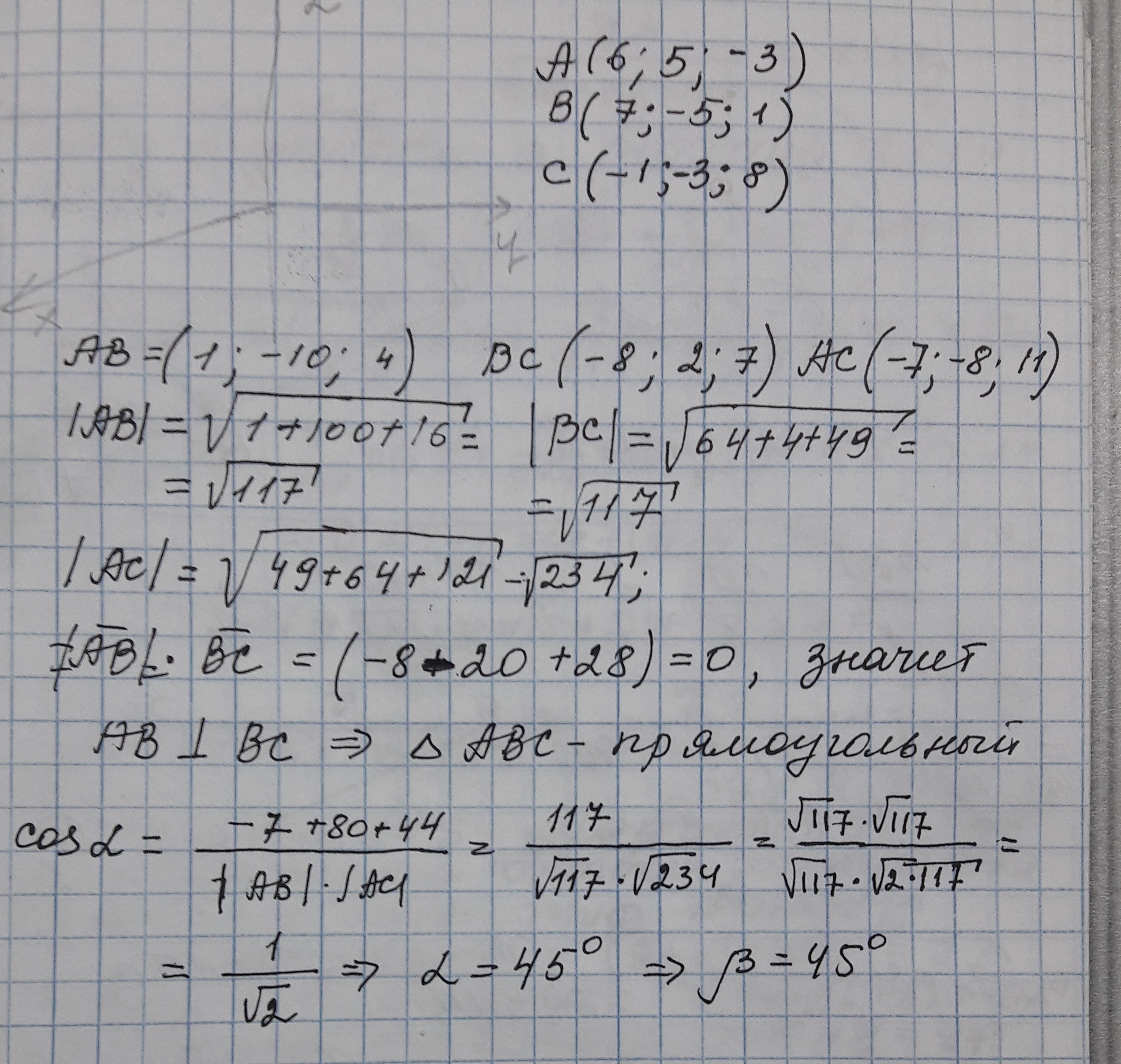 Заданы вершины треугольника A(6;5;-3;), B(7;-5;1) И C (-1;-3;8). Докажите что этот треугольник прямоугольный и найдите косинусы его острых углов