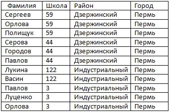 2. Поля таблицы - Фамилия, Школа, Район, Город. Все поля текстовые.