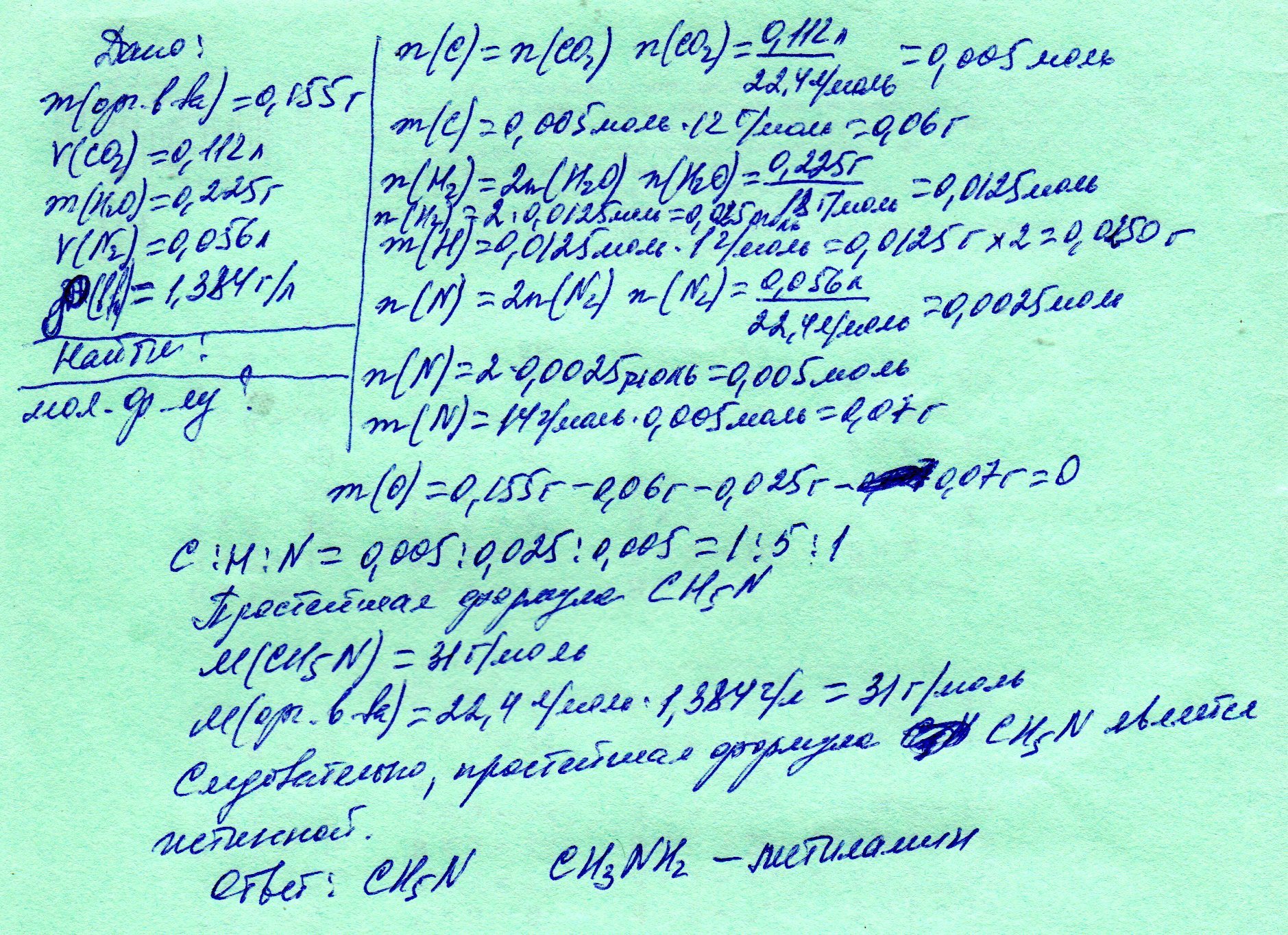 При сжигании 0,155г газообразного органического вещества выделилось 0,112л(н.у) углекислого газа,0,225 г воды и 0,056л(н.у) азота Плотность паров вещества 1,384г/л Найти молекулярную формулу