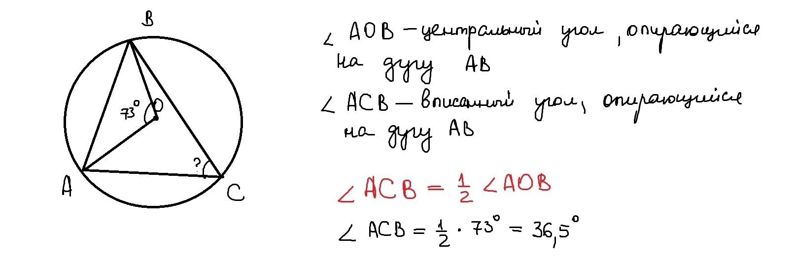 треугольник ABC вписан в окружность с центром O найдите угол ACB, если угол AOB равен 73градуса.