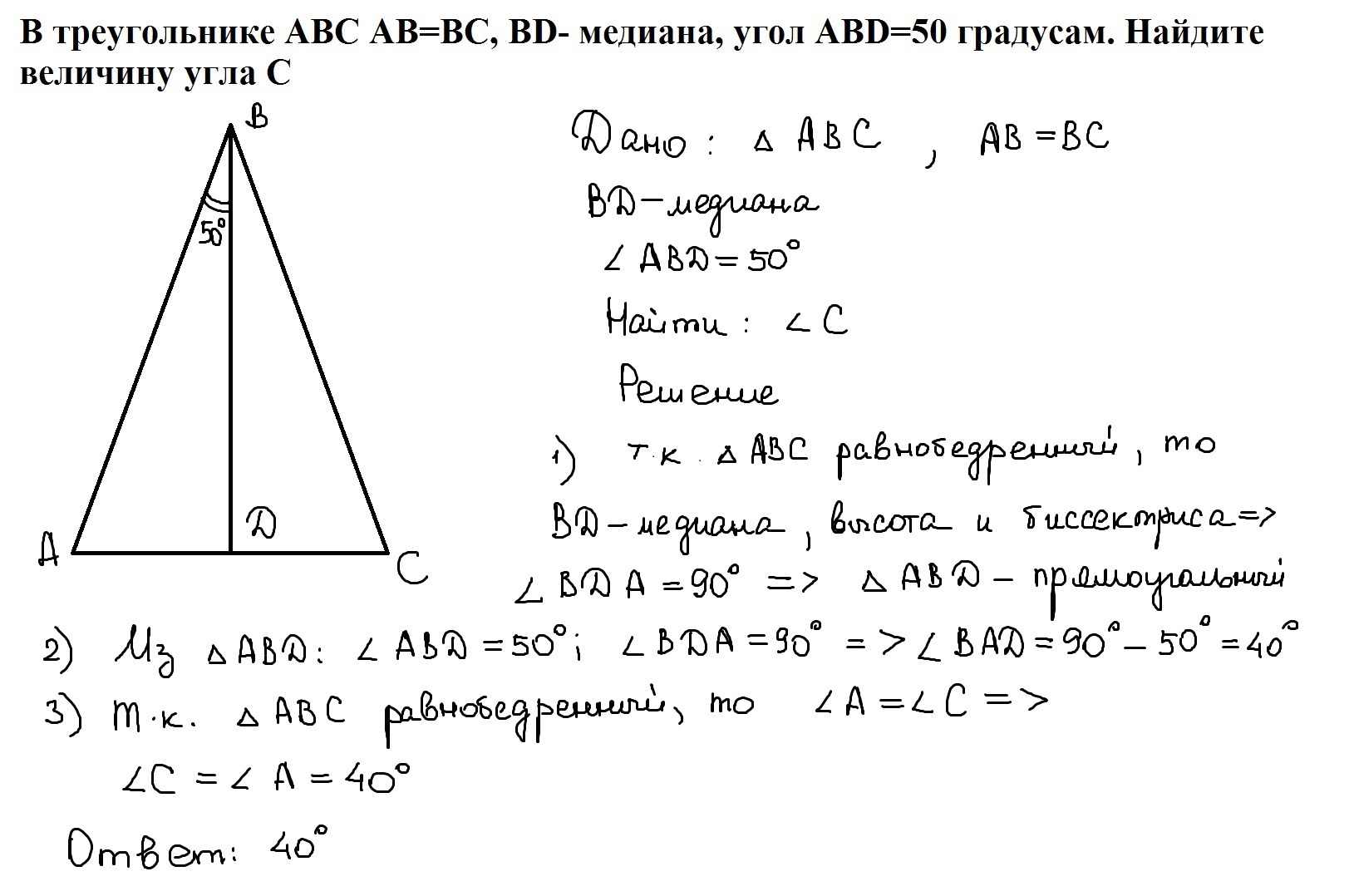 В треугольнике АВС АВ=ВС, ВD- медиана, угол АВD=50 градусам. Найдите величену угла С